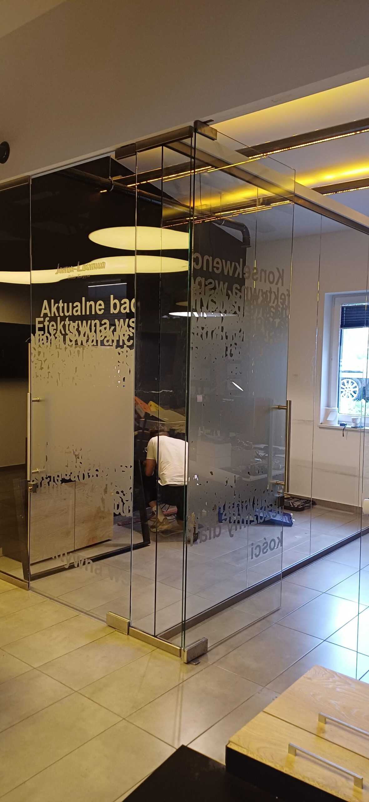 Przebudowa zabudowy szklanej biura – nowe ściany i drzwi wahadłowe