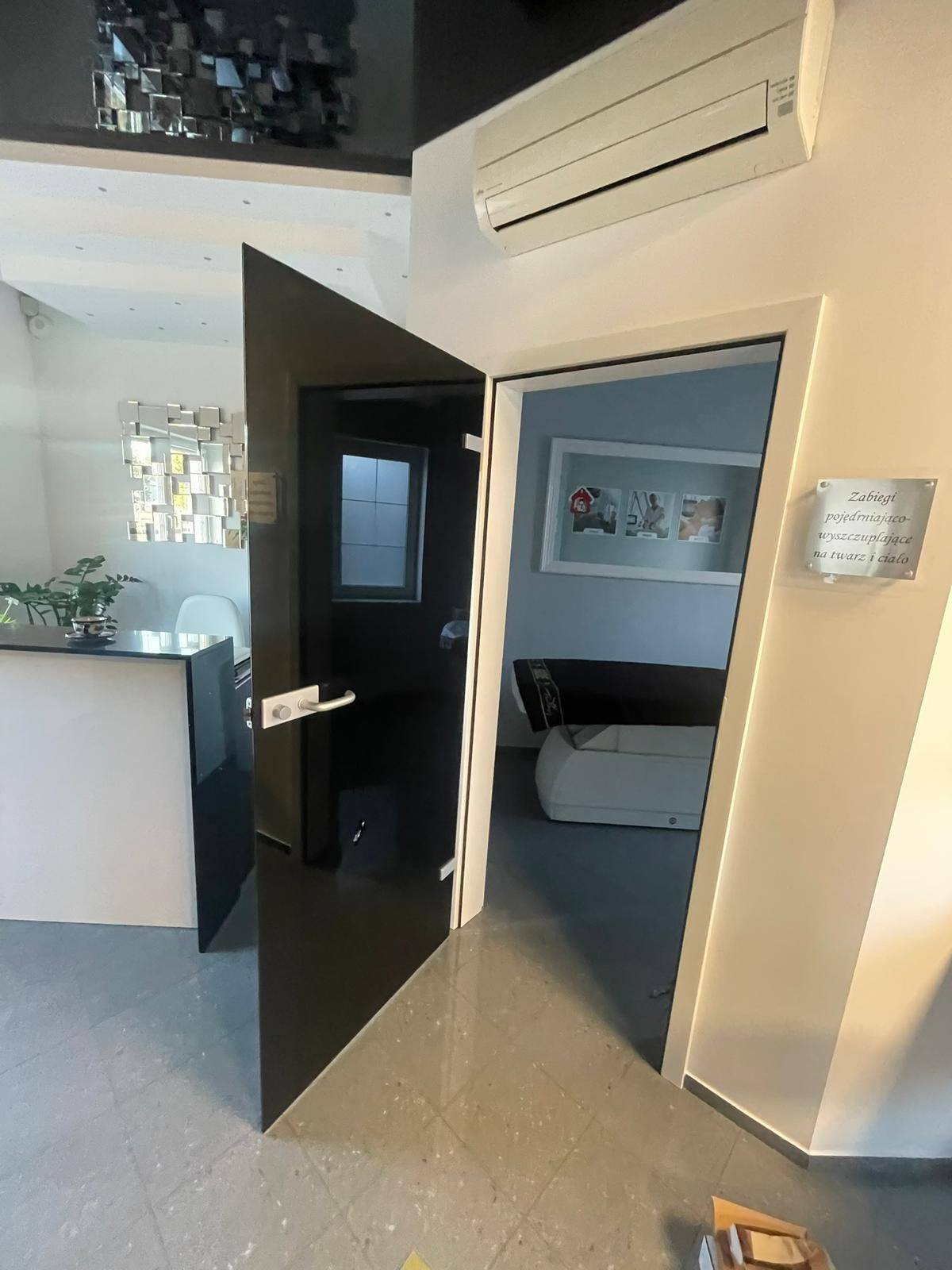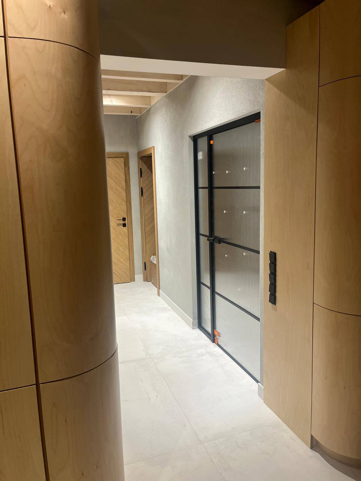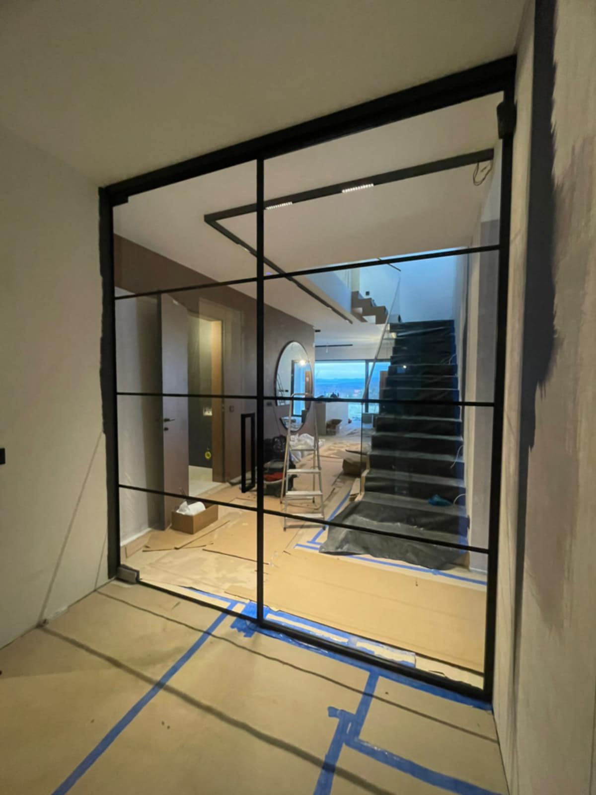 W ramach realizacji wykonaliśmy i zamontowaliśmy drzwi ze szkła w kolorze czarnym, osadzone w ościeżnicy drewnianej Projekt został dopasowany...