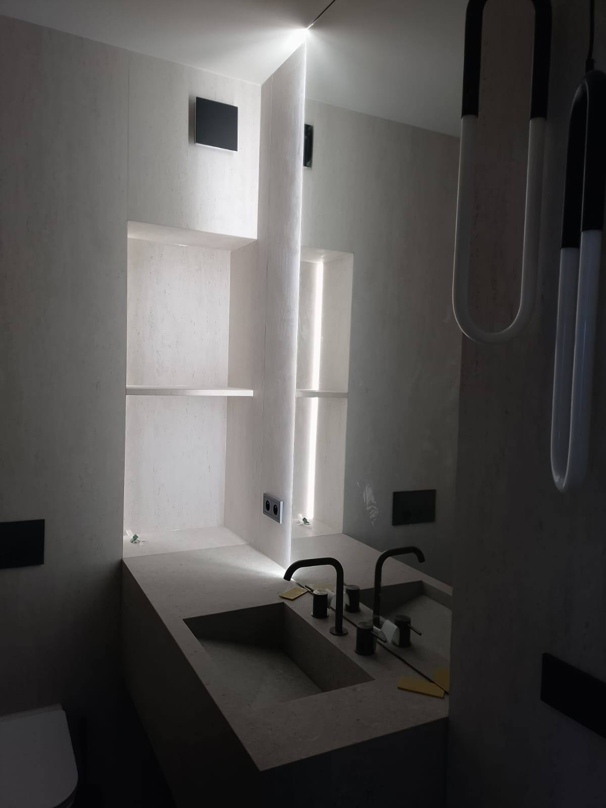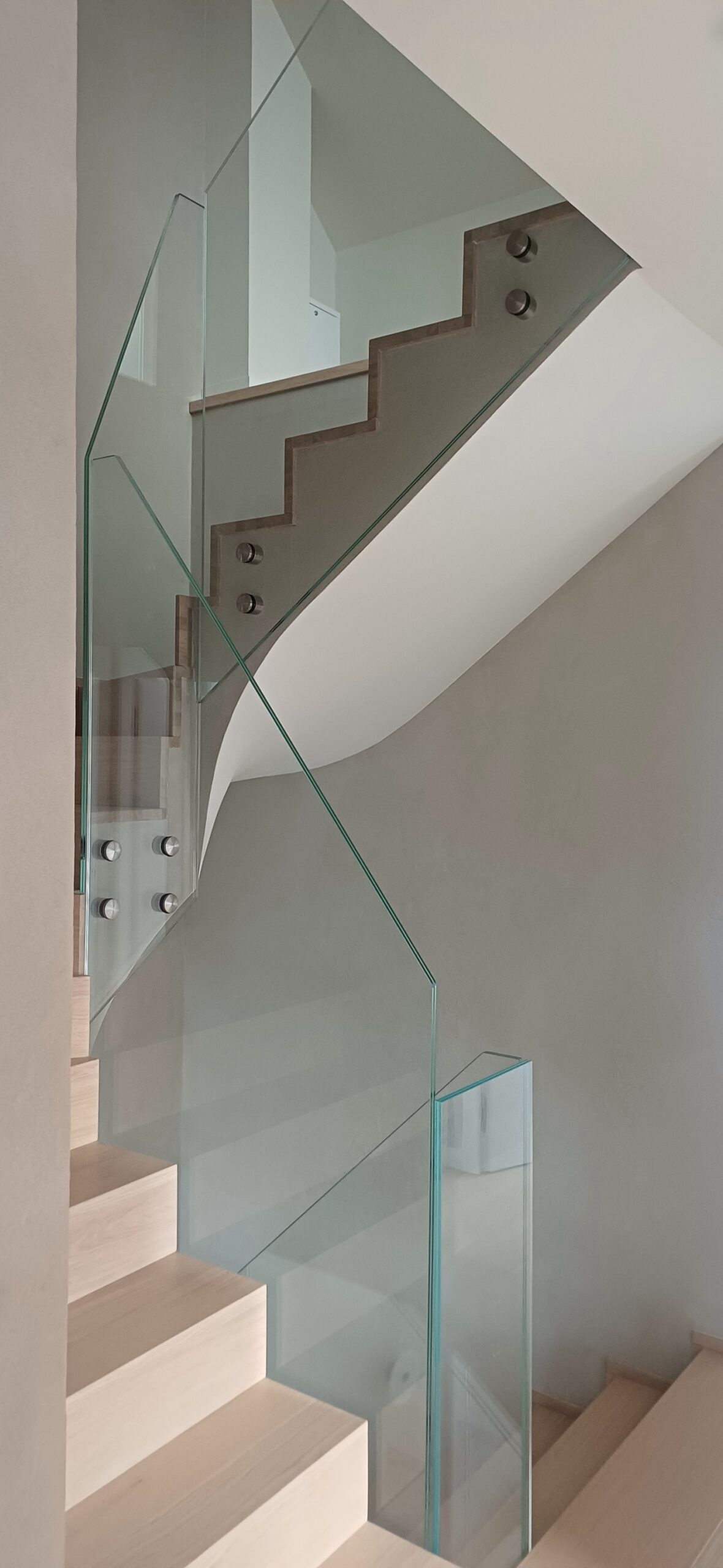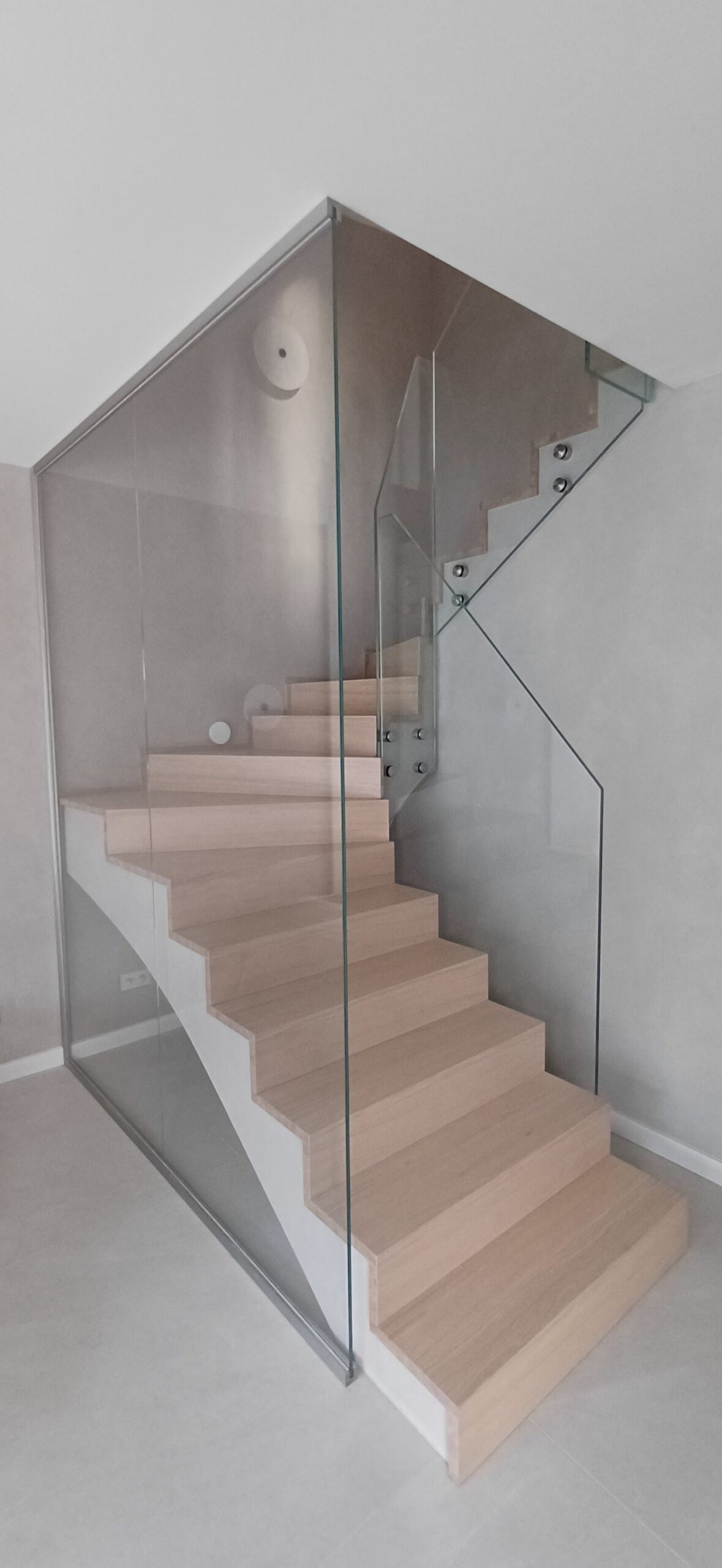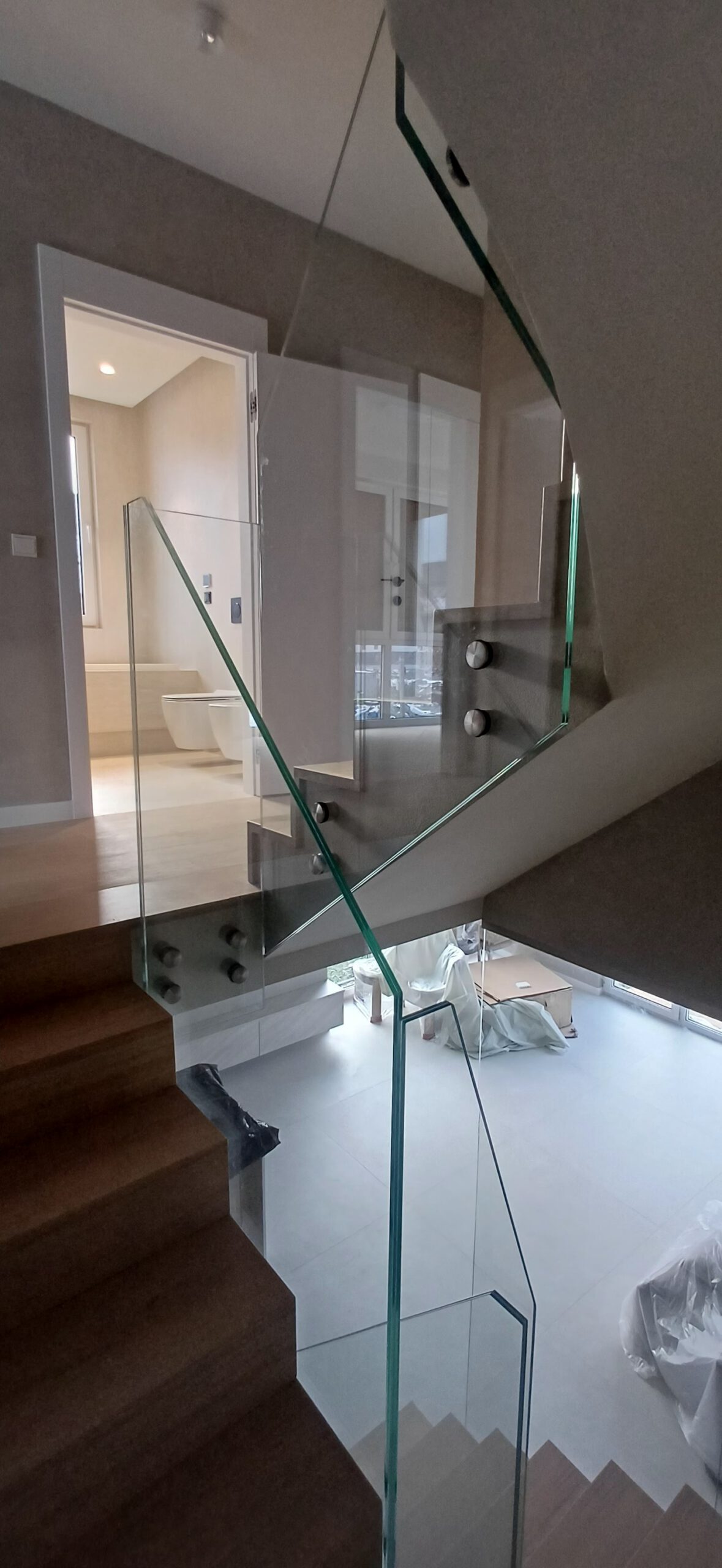 W realizacji zastosowaliśmy szkło Optiwhite, które dzięki swojej wysokiej przejrzystości zapewnia maksymalną estetykę i lekkość wizualną. Balustrada na mocowaniach punktowych podkreśla nowoczesny charakter schodów, a minimalistyczne ścianki i drzwi szklane doświetlają przestrzeń i optycznie ją powiększają. Uzupełnieniem całości są precyzyjnie dopasowane lustra oraz elegancki parawan prysznicowy.
