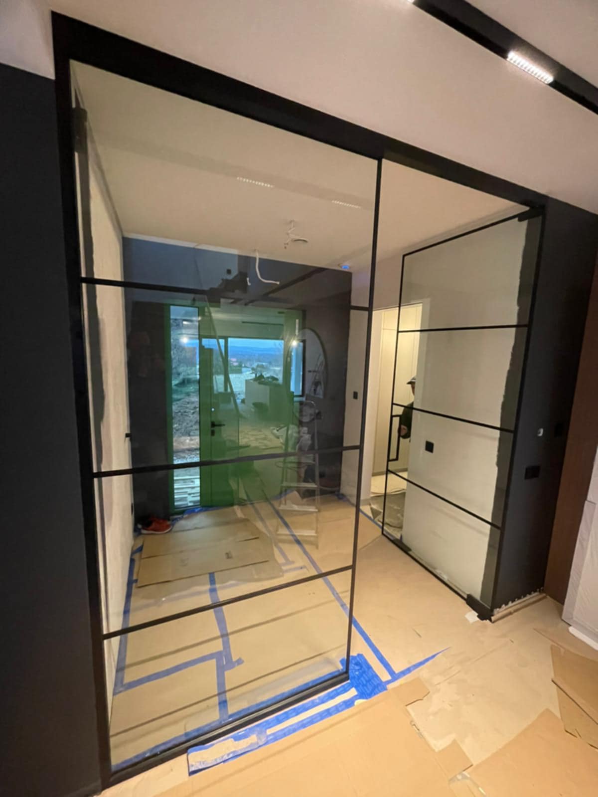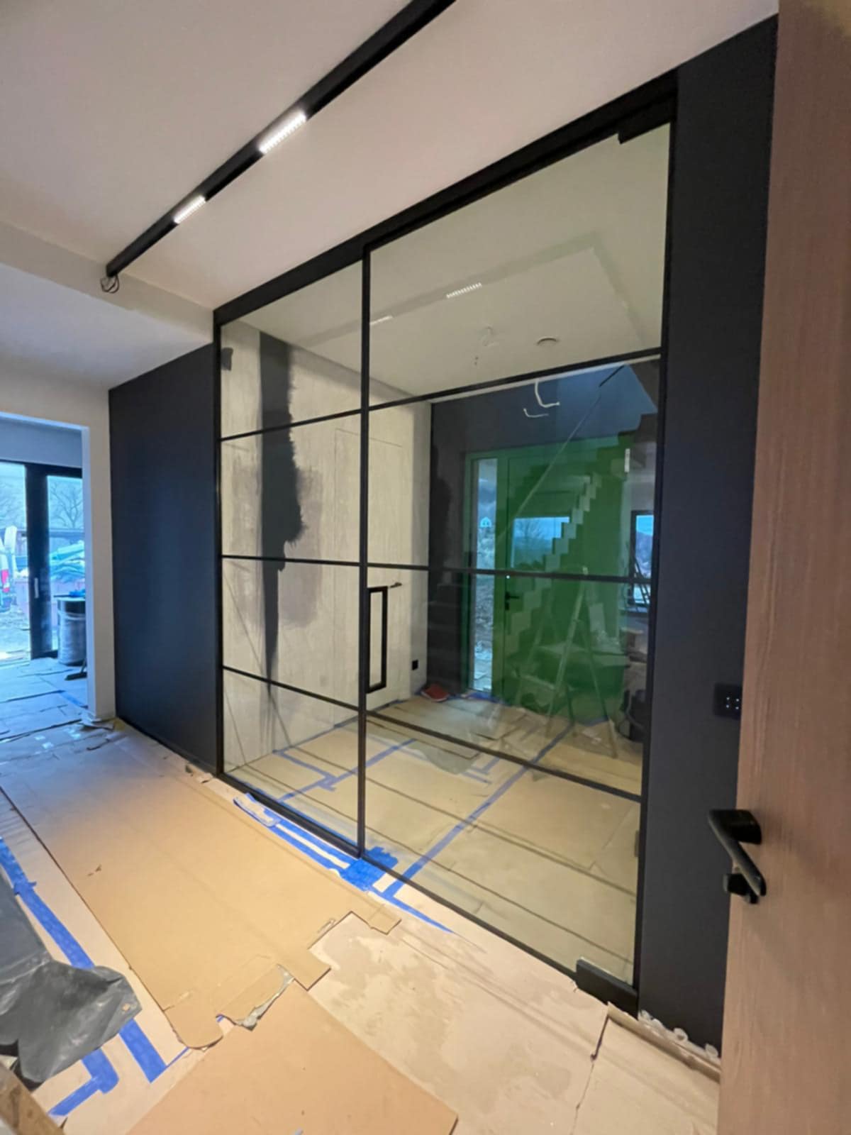 W ramach inwestycji wykonaliśmy nowoczesne zabudowy szklane, w tym systemy drzwiowe oraz stałe przeszklenia w stylistyce loftowej. Zastosowane rozwiązania podkreślają przestronność wnętrza, zapewniają odpowiednie doświetlenie oraz zachowują wysoką estetykę i funkcjonalność.